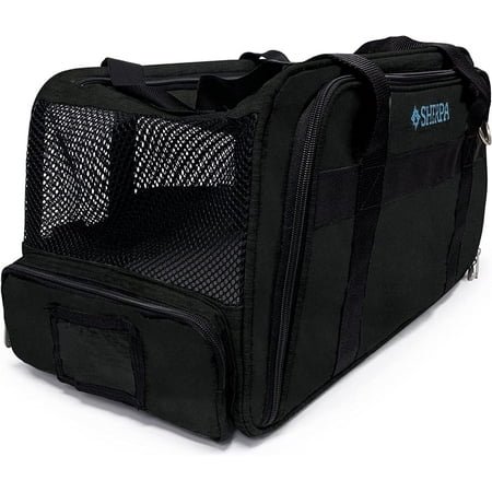 AIRLINE APPROVED: The Sherpa Expandable Travel Pet Carrier is airline approved and part of our Guaranteed On Board program, which provides comfort and peace of mind to pets and their owners; it’s perfect for traveling by air, bus, car, or train IN-CABIN FRIENDLY: Our patented spring wire frame allows the rear end of the carrier to be pushed down several inches to easily fit under airplane seats in compliance with most major airline requirements and FAA regulations; PERFECT FOR TRAVEL: Features mesh panels for ventilation, escape-proof locking zippers, as well as top and side entries for easy and comfortable loading; designed with an expandable size to give your pet more room to stretch out and lounge comfortably VERSATILE DESIGN: Can be carried by hand with the padded top handle, or over the shoulder using the included detachable carrying strap and integrated metal D-rings – whichever suits your comfort and convenience MULTIFUNCTIONAL: The pet carrier can also be used a soft-sided crate for regular outings and vet visits with cats and small dogs; includes a large storage pocket, and a luggage strap that doubles as a seatbelt security pass-through for car rides PRODUCT DETAILS: Black, Medium, 19.5″ x 11″ x 10.5″; fits pets up to 16 pounds CHOOSING THE RIGHT SIZE: Choose the perfect carrier size based on your pet’s measurements, followed by their weight; make sure not to exceed the maximum weight limit, and allow enough space for your pet to change positions inside the carrier Special Feature:Airline Approved, Guaranteed On Board Manufacturer recommended age : 1 month and up Directions:Use as directed. For pets only. Pets should be supervised when using this product. Please read all packaging instructions, warnings, and cautions upon receipt. Remove any part that becomes loose or detached. Packaging may contain small parts, discard after opening. Dispose of packaging properly or retain in safe place. For questions, concerns, or if you are dissatisfied with the product, please reach out to our customer service team at: customerservice@petwisebrands.com (email) or 415-721-7400 (phone). Model Name:Expandable Pet Carrier Number of Items:1 Style:Lounge Specific Uses for Product:Behavior, Outdoor Directions:Use as directed. For pets only. Pets should be supervised when using this product. Please read all packaging instructions, warnings, and cautions upon receipt. Remove any part that becomes loose or detached. Packaging may contain small parts, discard after opening. Dispose of packaging properly or retain in safe place. For questions, concerns, or if you are dissatisfied with the product, please reach out to our customer service team at: customerservice@petwisebrands.com (email) or 415-721-7400 (phone).