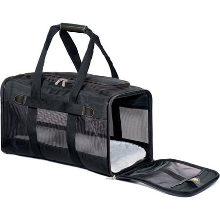 Perfect for traveling in style and comfort by plane or car, for an adventure or just a trip to the vet Patented spring wire frame allows the rear end of the carrier to be pushed down several inches to conform to under-seat requirements Locking zippers for safety and mesh windows for ventilation