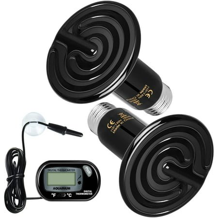 About this item Perfect 24 hours heat sources with long lifespan: Great for reptile and amphibian terrariums, incubating poultry heater. The ceramic heat emitter for use in standard E26 lamp base and easy to install, rated for up to 10, 000 hours No light emitted: Bulb does not emit any visually detectable light that can disturb the sleep cycle of your pets. Perfect heat radiation feature, great for lizard, chicken, turtle, snake, chameleon, bearded dragon, aquarium, with one digital thermometer included Free Digital Thermometer:Large LCD display screen, simple operation. Temperature reading range -50℃ ~ + 70℃(-58℉~+158℉); Operating temperature -10℃ ~ +50℃(+14℉~+122℉). ℃ – ℉ switchable Specification: Voltage: AC 110-120V; Power: 150W; Material: ceramic, metal, NiCrAl; To avoid scald, please wait at least 1 hour to cool down after turning off the bulb. ATTENTION: Use only with a porcelain socket, as the plastic socket may melt the lamp holder Note: the surface temperature of the ceramic bulb is generally high, please keep an appropriate distance from flammable materials and pets, so as not to cause serious consequences Included components: Ceremic Heat Bulb, Digital-Thermometer