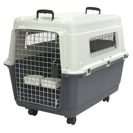 See size chart photo and video to help determine correct size and features Your dog’s measurements should be under 29” L x 20” H for the Large kennel IATA airline approved 2 dishes and 4 live animal stickers metal bolt and nuts included For dogs up to 50lbs. For kennel trained pets only. Wheels snap on and off as needed Sturdy and durable plastic construction makes for easy assembly. Set-Up Size: Without Wheels – 31.5” L x 22” W x 23” H inches, With Wheels – 31.5” L x 22” W x 25.25” H; 15.25 lbs.
