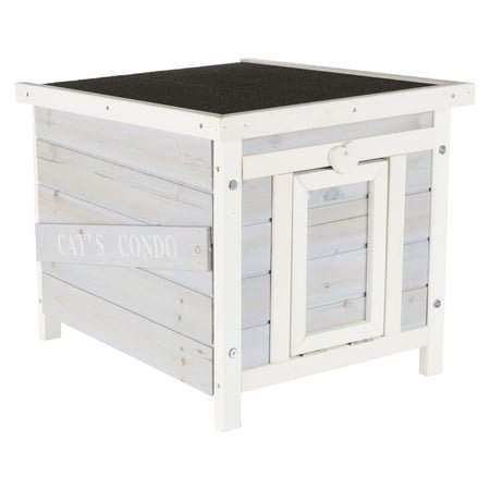 ALL-SEASON PROTECTION: Designed with weatherproofed solid wood and asphalt shingles to protect your pet from the elements – it is the ideal combination of warmth in winter and shade in summer PET-FRIENDLY DESIGN: This versatile cat shelter is suitable for feral cats, small animals, and small dogs. It features a ramp that doubles as a door, offering a safe and comfortable space for your pets to rest and sleep STYLISH AND FUNCTIONAL: A stylish and functional design that complements any outdoor space. The hinged roof with a locking arm allows easy access to a clean home EASY ASSEMBLY AND CLEANING: Assembly is straightforward with pre-drilled holes and necessary hardware. The home is designed with a hinged roof with a locking arm to allow easy access to clean home CAT HOUSE DIMENSIONS: Overall – 20.1″L x 16.5″W x 16.9″H; Interior – 13.75″ W x 18″L x 11.5″H; Door Opening: 6.75″W x 9.75″H
