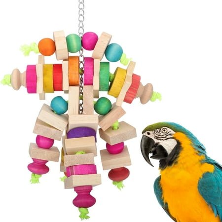 TSV Parrot Chewing Toy: Made from food-grade colors natural wood, and cotton, safe for birds to chew and peck Completed with pure handmade which are more bite-resistant and durable Multiple layers of blocks encourage climbing and exploration, satisfying your bird’s instincts Can indulge parrot’s natural urge to chew with the cotton rope, promoting beak health Suitable for various bird habitats, from cages to play areas Comes with hooks for effortless hanging Suitable for anchovies, parakeets, cockatiels, conures, macaws, love birds, and finches Package Includes: 1 x Bird Toy