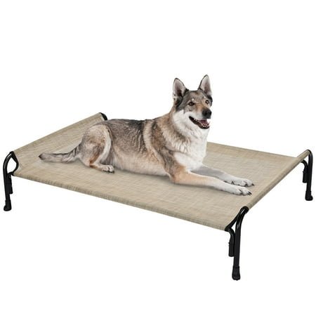 Veehoo Cooling Elevated Dog Bed, Outdoor Raised Dog Cots Bed for Large Dogs, Chew Proof Standing Pet Bed with Washable Breathable Mesh, No-Slip Feet for Indoor Outdoor, Large, Beige Coffee Veehoo Original Elevated Dog Bed Material: Powder-Coated Steel and Textilene Mesh Fabric. Powder-Coated Steel: 1, Snap-on design for easier installation. 2, Non-Slip Rubber feet keep the pet bed from sliding. 3, Design of connecting lines between pipes. Textilene Mesh Fabric: 1, Allows air to flow, keep cool ever. 2, Allow urine to go through, water will not pool up. 3, Heat-resistance, sturdy and machine washable. Size: Medium – 35.5″ x 25.5″ x 10.6″ , can hold the weight up to 80 lbs. Large – 43″ x 30″ x 10.6″, can hold the weight up to 110 lbs. X-Large – 47″ x 32″ x 10.6″ , can hold the weight up to 150 lbs. XX-Large – 59″ x 35.4″ x 10.6″ inch, can hold the weight up to 150 lbs. Why Raised Dog Bed? Sleeping with an elevated dog bed is more comfortable, cleaner, dryer, and healthier compared to the ground. Why Veehoo Original Raised Dog Bed? 1, The slope headrest design provides support for your dog while sleeping, and helps with neck health. 2, Compared to regular dog beds, the components are simpler and clearer. There are connecting lines between the pipes, eliminating the need to hunt around for pipe parts. 3, Quick installation even by yourself. The dog bed can be directly installed with the snap-on design. No screws and wrenches needed. Why Veehoo? All products from Veehoo are carefull designed by our designers, we have always emphasized quality, design and beauty. Click the Veehoo Store for more pet supplies from Veehoo.