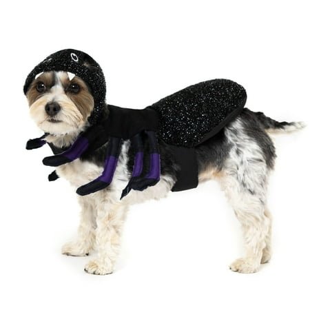 Halloween Spider costume comes with outfit with coordinating headpiece and is made of a textured black shimmery fabric. The Spider outfit has easy, comfortable fit hook and loop closure around the pet’s neck, with wide elastic with hook and loop fastener for comfortable, adjustable fit around the pet’s belly. Spider headpiece comes with embroidered eyes, complete with earholes, and elastic cord and toggle closure that goes under the chin for comfortable, adjustable fit. The spider costume includes purple and black printed legs and a stuffed tail-end. Easy leash access in this two-piece costume. Remember to measure your pet for the perfect fit and refer to our handy sizing grid. For a great fit for this Halloween pet costume, measure from the base of the pet’s neck to the base of the pet’s tail. Care instructions: Hand wash in cold water. Do not bleach. Lay flat to dry. XS: 10.5in Back Length (26.6 cm) fits most Chihuahuas, Miniature Poodles, Cats S: 13in Back Length (33.0 cm) fits most Pugs, Shih Tzus, Boston Terriers, Cats M: 17in Back Length (43.1 cm) fits most Beagles, Standard Poodles L: 20 in Back Length (50.8 cm) fits most Labradors, German Shepherds, Boxers
