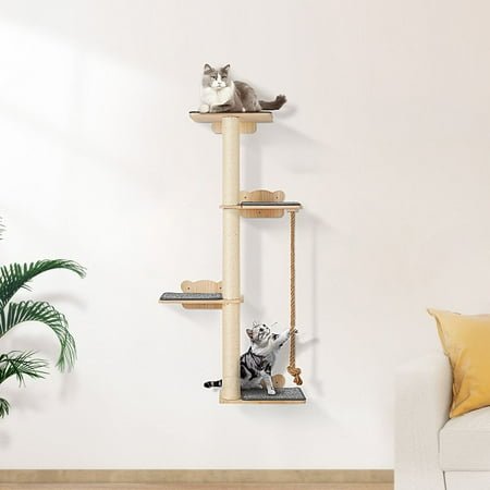 Cat Fun Playground: This cat wall rack includes 4 springboards, 3 cat posts, and a cat rope, meeting your cat’s needs for climbing, playing, resting, and scratching. It creates a rich environment for your feline to enjoy hours of fun and relaxation. Comfortable and durable material: This wall-mounted cat frame is made of E0 grade pine, which is sturdy and able to support up to 40 pounds (18.14 kg). Natural pine is non-toxic and odorless, allowing cats to climb and play safely. The platform surface is covered with plush pads, which are non-slip and soft, protecting your cat’s paws. Easy Installation: The package includes all the necessary accessories and installation guides. Just follow the steps, insert the expansion tube into the wall, and then use screws to secure the board. The installation process is simple and one can easily set it up immediately. Comprehensive Accessories: The cat wall furniture set is equipped with metal screws, expansion tubes, butterfly anchors, screwdrivers, T-shaped hexagonal screwdrivers and installation drawings, which can be easily installed on various wall types. Wide range of uses: Our cat wall furniture sets can be arranged freely to suit different spaces and preferences. The wall-mounted design is simple and lovely, whether it is installed on the living room, bedroom or patio wall, it can save ground space and integrate perfectly with your home decoration.