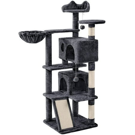 Yaheetech 57.4”H Cat Tree Tower Cat Tree with 2 Condos, Scratching Posts, Ramp, Dark Gray Multi-Tier Fun & Comfort: Designed with multiple levels, this cozy cat tower includes 2 enclosed hideouts and 2 elevated platforms, giving small cats plenty of space to nap, climb, and play Lofty Lounging Spots: Let your cats take in the world from above! The 2 elevated perches offer a perfect lookout for curious kitties who love high vantage points. It’s a vertical playground that taps into their natural climbing instincts Sturdy & Safe Design: A wide base, durable construction, threaded rod connections, and a safety strap help keep the structure upright and secure—even with multiple cats at play Charming & Practical: Whether placed in your living room, a pet café, or a pet shop, this cat tree tower adds a touch of charm. Available in various color options, it blends well with home décor while offering your cats a cozy and fun retreat Measures 19.1 inches wide and deep, and 57.4 inches high Made of engineered woood, velvety fabric and sisal rope Note: The pet species and usage scenarios indicated in the product descriptions and images are for reference only. Please order products based on your pet’s characteristics and needs.