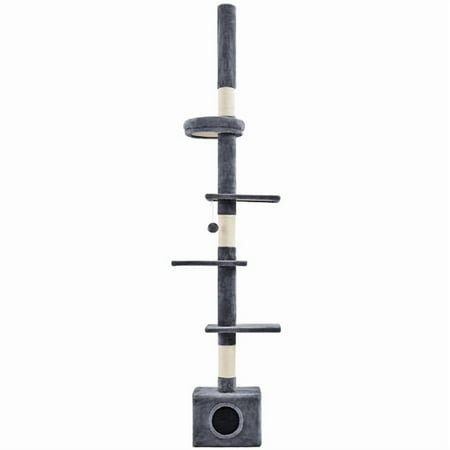 Yaheetech 7.4-8.7FT Multilevel Floor To Ceiling Cat Tree with 4 Perches, Dark Gray Removable & Portable: The top post of this height-adjustable cat tree snugly fits against the ceiling by a tension rod, allowing you to easily relocate it whenever you want without any hassle Freely Adjustable Height: Equipped with an adjustable mechanism, this five-level tall cat tower stretches from the floor to a 7.4-8.7 ft. high ceiling. The matching cover hides the adjustable mechanism, giving the tower a more sophisticated appearance Pet-friendly & Sturdy: Made of 1/2″ thick CARB P2-compliant particleboards and soft plush, this floor-to-ceiling cat tree provides excellent stability and safety for your active companions, with a wall anchor for added protection Maximize Vertical Spaces: The tall cat tree provides ample perching, scratching, and climbing space while minimizing its footprint on your floor. Measuring 16″ L and 12″ W, this compact design is ideal for small apartments and other limited spaces Multi-Levels for Hours of Fun: This five-layered cat tree tower features four perches that can be positioned in various directions for customizable climbs. The top perch has foam edges for comfort, and the spacious bottom condo is a cozy hideaway Specifications: Color: Dark Gray; Materials: Plush, Particleboard, Sisal; Assembled Dimensions: 26″ L × 16″ W × 89-104.5″ H; Adjustable Height: 89-104.5″; Maximum Weight Capacity: Condo/Perch (ea.): 11 lb