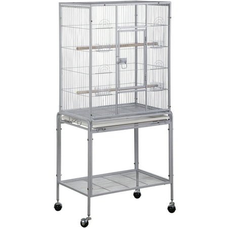 ZENY Bird Cage features one large front door and a bottom shelf for additional storage space, this flight cage stands on rolling casters and is easily moved from room to room. Four plastic double cups and 2 wood perches are included in this economical extra large cage. Our bird cage is 25.2-inch long, 17-inch wide and 53-inch high with 1/2-inch wire spacing, makes the perfect home for multiple parakeets, canaries or finches. This bird cage with stand is the ideal size for Caciques, Conures, Jardine’s Parrot, Meyer’s Parrots, Pionus, Poicephalus, Red-bellied and other similar size birds to perch and live comfortably.