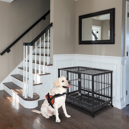Introductions: This is our brand new heavy duty strong dog cage with wheel. This cage is designed in particular with a heavy duty steel frame, a perfect choice for you to keep your pets safe and comfortable. Each bar is firmly welded to ensure the strongest sturdy construction. Double-door design with one in front and the other on top allow easy access to our pet. You can change food and water for your pet from the front door. When you want to take your pet out from the cage, the door on the top will work. The front door has double latches and top door with one, which are quite strong to protect our pet from escaping. Grate design floor allows dirties to drop down to the below tray, keep a clean environment for pets. Both of the grate floor and steel tray can be easily slide out from the bottom for easy and convenient cleaning. Besides, the cage is equipped with four rolling casters for easy moving and two of them are lockable design to avoid accidental moving. Features: 1. High quality and brand new 2. Heavy duty steel frame, strong and durable 3. Equipped with four casters for easy moving and two of them are lockable to avoid accidental move 4. The grate floor and steel tray on the bottom can be slide out for easy cleaning 5. Double door design with one on top and the other in front allow for easy access 6. Front Door with two latches for easy access 7. These pet homes are constructed using a 3/4″ frame and 1/2″ diameter tubes made of top quality steel 8. Folds down easily, take it anywhere 9. Easy to assemble Specifications: 1. Material: Iron 2. Color: Black 3. Applicable Pets: Small or Medium Dog like American Eskimo, Bull Terrier, Springer Spaniel,Norvegian Elkhound,Australian Cattle Dog,Bulldog,Finnish Spitez, cat,rabbit and so on 4. Size: 36.5″ / 92.5cm 5. Dimensions: (36.5 x 24.4 x 30.1)” / (92.5 x 62 x 76.5)cm (L x W x H) 6. Weight: 17.5kg / 38.6lbs 7. Door Dimensions: (13.20 x 20.07)” / (33.5 x 51)cm (L x H) Package Includes: 1 x Cage 1 x Instruction
