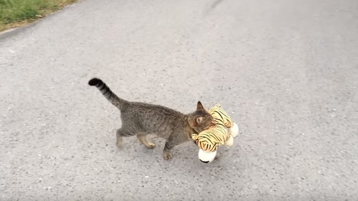 Watch as this cat goes to the neighbors to borrow a tiger plus toy. The cat walks with such confidence…